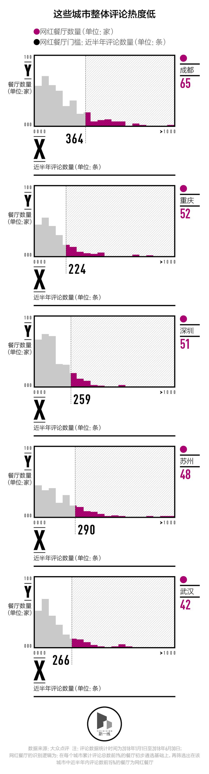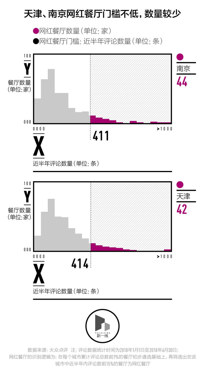 考虑到每个城市的人口基数和用户评论习惯并不一致,网红餐厅的筛选标准需要参照每个城市内餐厅评论数量的具体分布状况。新一酱首先筛选了每个城市历史累积评论总数靠前1%的餐厅,它们代表了城市从过去到现在的人气餐厅,在此基础上又筛选出近半年内评论数前15%的餐厅,将它们认定为网红餐厅。