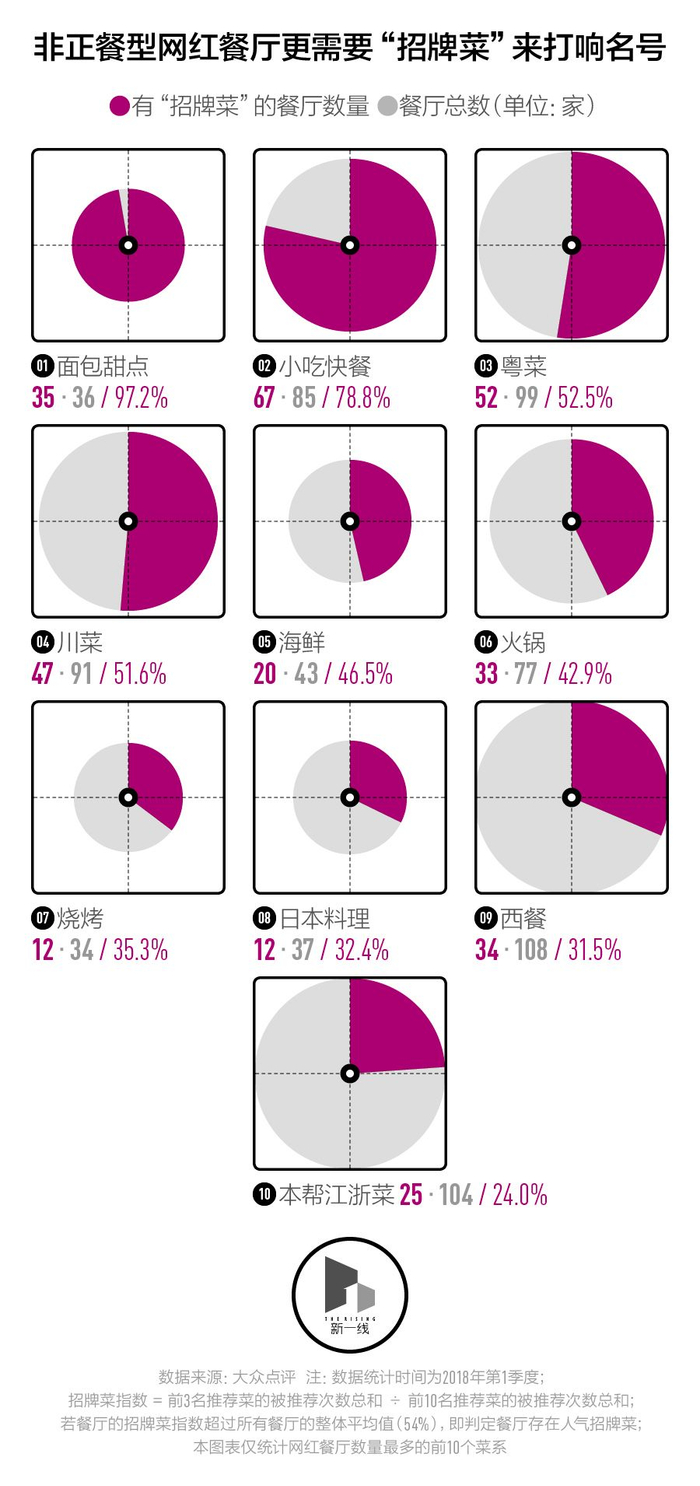 新一酱以餐厅前3名推荐菜的被推荐次数总和占前10名推荐菜被推荐次数的比例来识别一家餐厅是否有招牌菜。面包甜点和小吃快餐类的网红餐厅有招牌菜的比例分别达到了97.2%和78.8%。广州的南信牛奶甜品专家的主打便是双皮奶,排名第二的姜撞奶的被推荐次数只是前者的四分之一。