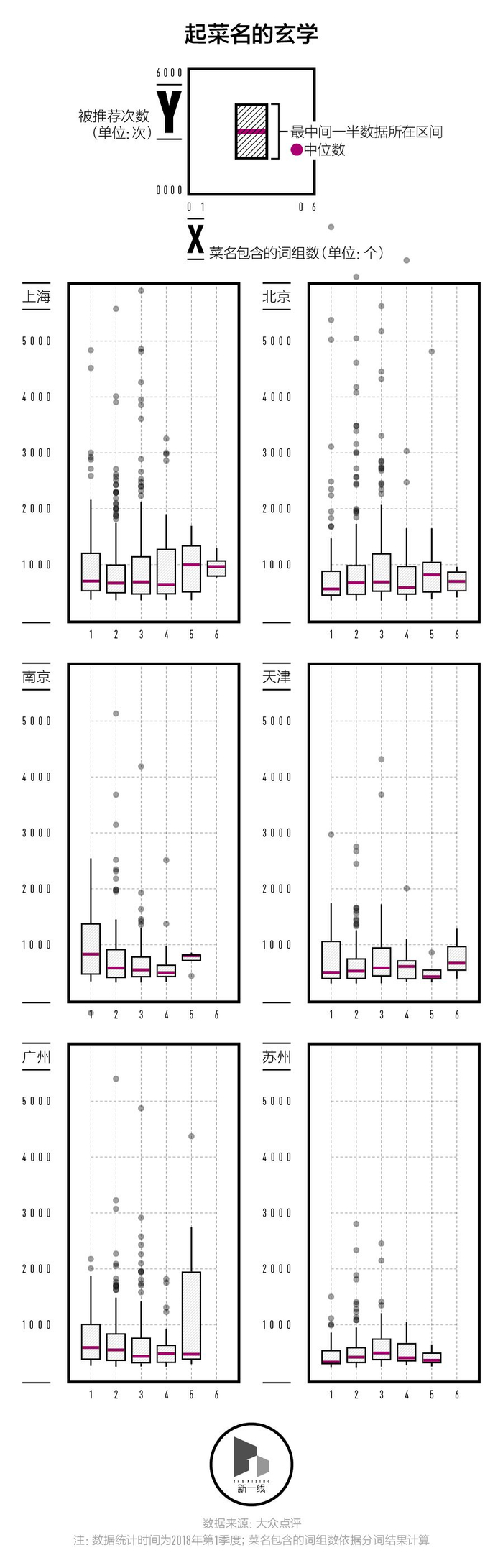 让我们先来学习一下如何读懂这一系列箱型图的关键部分:图表中“箱子”的底部为菜品被推荐次数的1/4分位数,箱子的顶部为菜品被推荐次数的3/4分位数——整个代表最中间一半的菜品的被推荐次数区间;而中间那道粗线则是这些菜品被推荐次数的中位数。