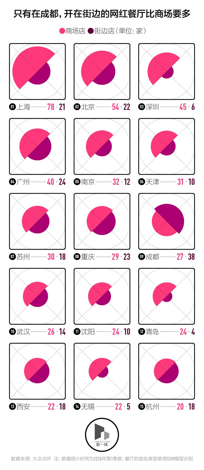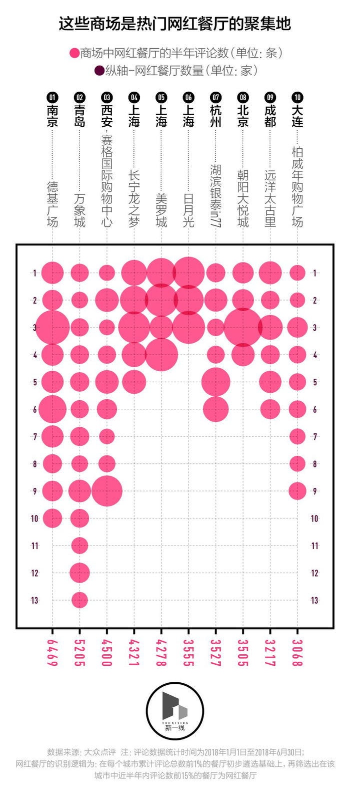 像新一酱一样经常因为等位时间过长,转而选择不那么热门的餐厅的人不在少数。商场和门店是共荣共生的利益共同体,这些具有超高人气的网红餐厅能够为商场带来可观的客流,而商场的人气提升也能为餐厅带来新的人气。为了进一步观察网红餐厅之间的共生关系,新一酱将分布间隔小于30米的网红餐厅合成了单个空间区域,在此基础上人工修正了餐厅所属的空间区域,得到了城市中网红餐厅热度最高的商场。