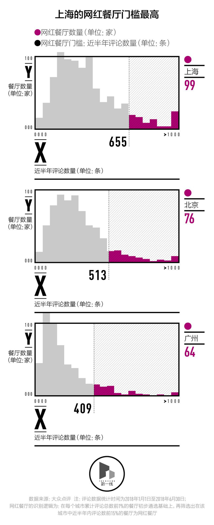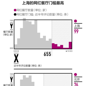 截至2018年第一季度,上海的餐厅总数达到了19.7万家,最终筛选出的网红餐厅只有99家,占比仅为0.05%。按照新一酱的计算标准,一家上海的餐厅想在这片红海中突围,成为金字塔顶端的99家网红餐厅的其中之一,它在半年内的评论数量需要达到655条。