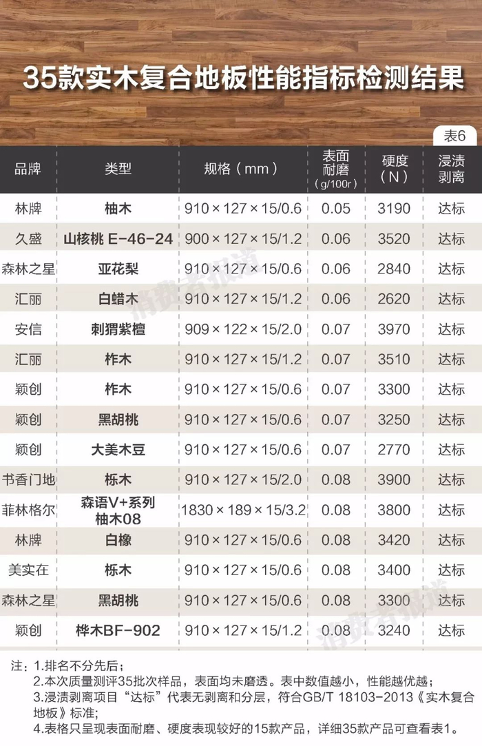 在环保指标上,34款实木复合地板在甲醛、TVOC的都符合标准。在性能指标上,35款样品的表面耐磨性都符合≦0.15g/100r的标准要求,7款样品硬度≥3500N,在受到尖锐物冲击时不易被损坏。