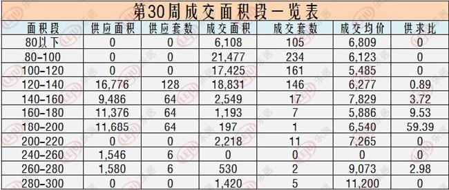 从成交面积段数据来看,成交量最高的为80-100㎡面积段,共计成交234套,占总成交量的33.52%;成交量排名第二的面积区间为100-120㎡面积段共计成交161套,占总成交量的23.06%;成交量排名第三的面积区间为120-140㎡面积段共计成交146套,占总成交量的20.91%;成交量排名第四的面积区间为80㎡以下面积段共计成交105套,占总成交量的15.04%;其余区间面积段成交量均不多。