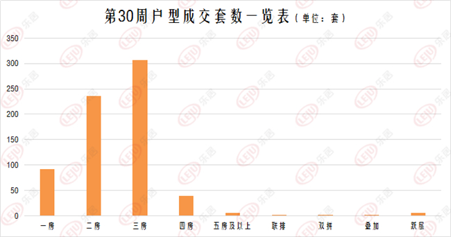 从各户型成交数据来看,上周成交量最多的为三房户型房源,共计成交306套,占总成交量的43.83%;二房户型共计成交236套,占总成交量的33.81%;一房户型房源共计成交92套,占总成交量的13.18%;四房户型房源共计成交39套,占总成交量的5.58%;其余户型成交量均较少。