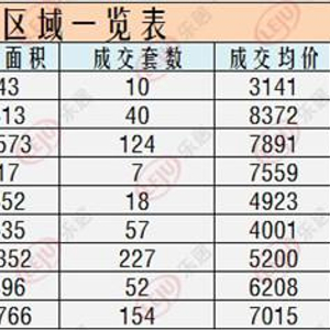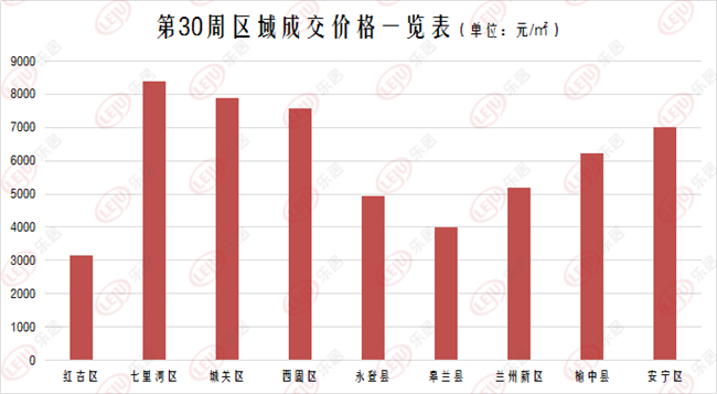 从各区域成交均价数据来看,上周成交均价最高的区域为七里河区,成交均价8372元/㎡;其次为城关区,成交均价7891元/㎡;排名第三的为西固区,成交均价7559元/㎡;其余区域依次为:安宁区7015元/㎡、榆中县6208元/㎡、兰州新区5200元/㎡、永登县4923元/㎡、皋兰县4001元/㎡、红古区3141元/㎡。
