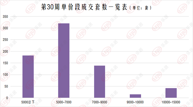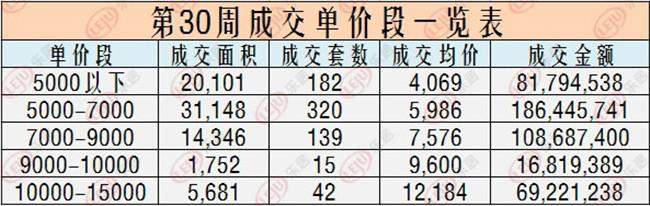 从成交单价段数据来看,上周成交单价5000-7000元/㎡的房源成交量最高,共计成交320套;5000元/㎡以下的房源成交量为182套,排名第二;7000-9000元/㎡的房源成交量为139套,排名第三;10000-15000元/㎡的房源成交量为42套,排名第四;9000-10000元/㎡的房源成交量为15套,排名第五。