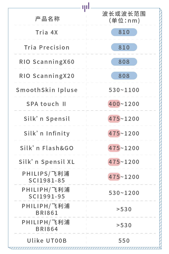 目前市面上的脱毛仪波长在 475nm~1200nm 之间,粗筛一下,我们按品牌分类,给大家做了一张表格: