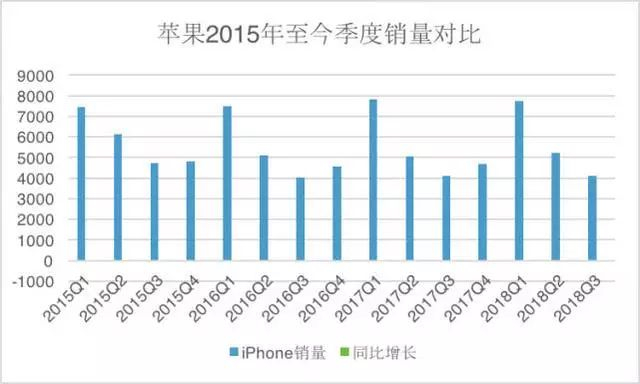 这意味着,2015-2018这数年来,iPhone的各年的季度销量几乎形成了水平趋势。每年一季度因新品发布因素形成一个七千多万台季度销量的高峰期,其他时间维持在4000-5000万台左右。从趋势看,iPhone的销量,停滞了。