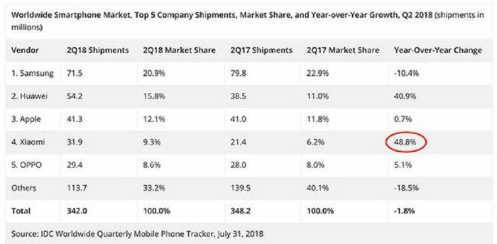 这个季度,苹果同比增长不到1%,三星下降10.4%,但华为猛增40.9%,小米猛增48.8%,排名第五的OPPO也实现了5.1%的增长,远超苹果。也就是说,宏观大环境确实影响了苹果和三星,但华为、小米和OPPO依然保持高速成长。