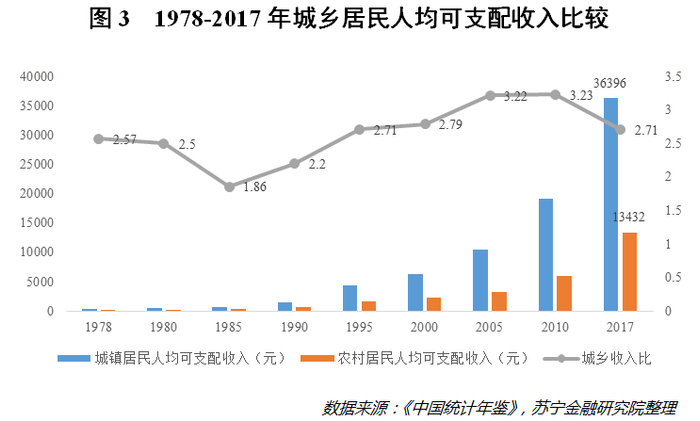 不过,从城乡居民收入比来看,在经历了长期的攀升后,近些年开始有下降的趋势,2017年为2.71,这比2010年的3.23低了不少。这说明城乡居民收入的绝对差值虽然在增大,但相对差值却有所缓和。