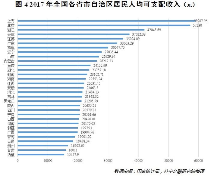 国家统计局数据显示,2017年全国各地区居民人均可支配收入最高的前5个省市分别为上海、北京、浙江、天津和江苏,而最低的5个省市分别为西藏、甘肃、贵州、云南和青海。其中,人均可支配收入最高的上海为58987.96元,最低的西藏仅为15457.9元,仅比上海的四分之一略高,收入差距可见一斑(参见图4)。