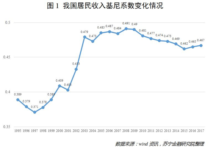 Wind数据显示,我国居民收入的基尼系数自2000年首次超过警戒线0.4以来,总体呈现出先攀升后稳定的态势。但值得注意的是,2003年至今,基尼系数从未低于0.46,而最近三年,更是逐年增大,由2015年的0.462升至2017年的0.467(参见图1)。