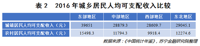 从东、中、西部及东北地区的城乡居民收入水平比较来看,东部地区的居民收入水平大幅度高于中西部和东北地区。2016年的数据显示,从城镇居民人均可支配收入层面看,东部地区是西部地区的1.39倍;从农村居民人均可支配收入层面看,东部地区是西部地区的1.56倍。倘若对比东部城镇居民与西部农村居民的人均可支配收入,那么差距无疑是更大的,前者是后者的将近4倍(参见表2)。