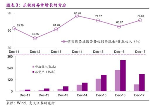光大证券表示,乐视网的现金流与利润的差异大且持续。在2017年以前,乐视网的盈利能力并不差,但是其现金流状况较差,现金流与利润之间存在持续的差异。乐视网高速扩张的过程中,现金流回笼不足是其资金链紧张的主要原因之一。我们可以看到发行人的营业收入逐年快速增长。同时,销售商品提供劳务收到的现金长期以来均低于当期营业收入。乐视网的营业成本/营业收入持续较低。2011-2017这几年中,上述比值基本处于0.6-0.7左右,最低为0.47,最高也仅仅为0.85。