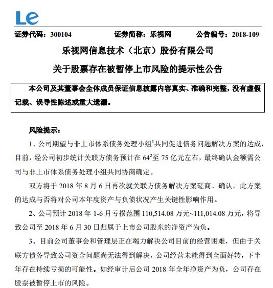 8月3日晚间,乐视网公告称,由于关联方债务导致公司资金问题尚无法得到解决,公司经营未能得到全面好转,下半年存在持续亏损的可能性。如果经审计后公司2018年全年净资产为负,公司存在股票被暂停上市的风险。