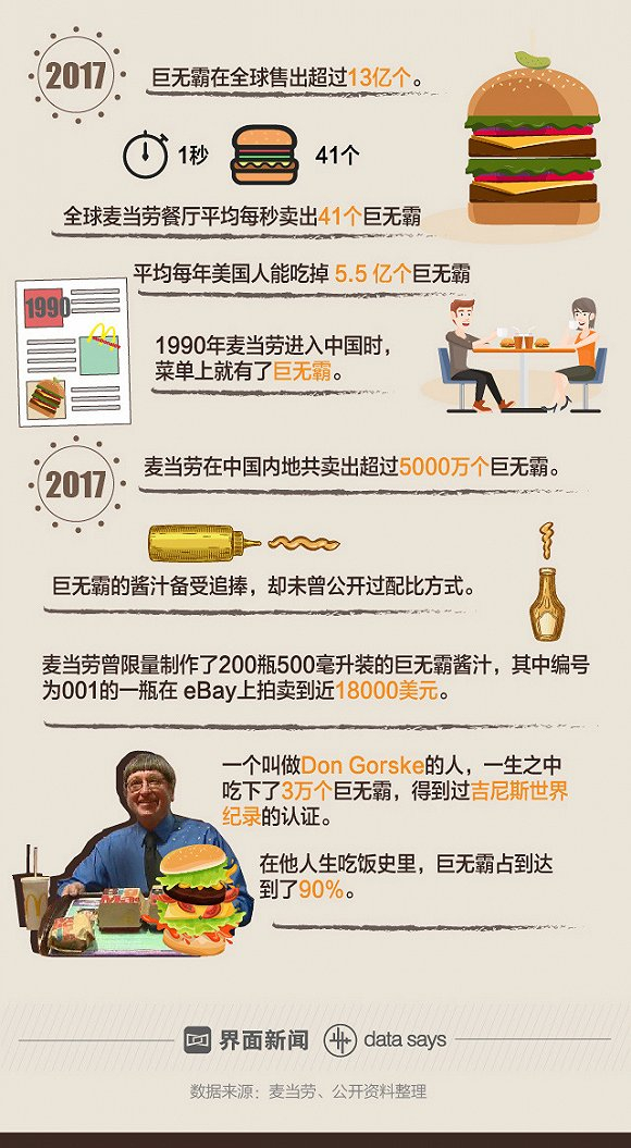 不只是在中国,巨无霸1968年起开始在全美国发售,这50年里它出现在了全球100多个国家和地区的麦当劳餐厅里。巨无霸也成为了这个快速餐饮品牌最为经典的产品,每年美国人能吃掉5.5亿个巨无霸。2017年,麦当劳在全球售出巨无霸超过13亿个,平均每秒售出41个。中国市场在去年一共卖出了5000万个巨无霸,其中1/5的巨无霸北京消费者被吃掉。