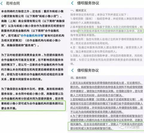 这一模式中,蚂蚁金服主要做导流和风险评估,收取服务费,但不兜底,由金融机构自主风控。根据花呗服务合同的描述,其身份定位是:蚂蚁小微小贷作为合作金融机构的“服务顾问”开展业务。不过FinX金融发现,在“合作金融机构详情”界面,至今尚为空白。