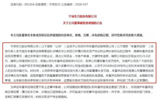 宁波东力表示,年富供应链法定代表人李文国及年富供应链高管团队涉嫌在与公司签订并履行购买资产协议和业绩补偿协议的过程中,隐瞒年富供应链实际经营情况,通过多家海外关联企业,侵占公司资金,与客户串通,大肆财务造假,骗取公司股份及现金对价21.6亿元,骗取公司增资款2亿元,诱骗公司为年富供应链担保15亿元,致使公司遭受重大经济损失。