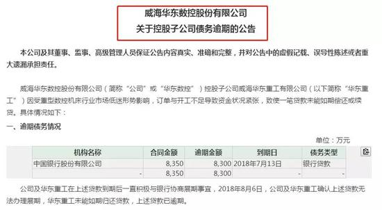 公告显示,华东重工逾期贷款背后所涉及金融机构为中国银行,逾期银行贷款合同金额为8350万元,逾期金额为8300万元,到期日为7月13日,已构成实质逾期。