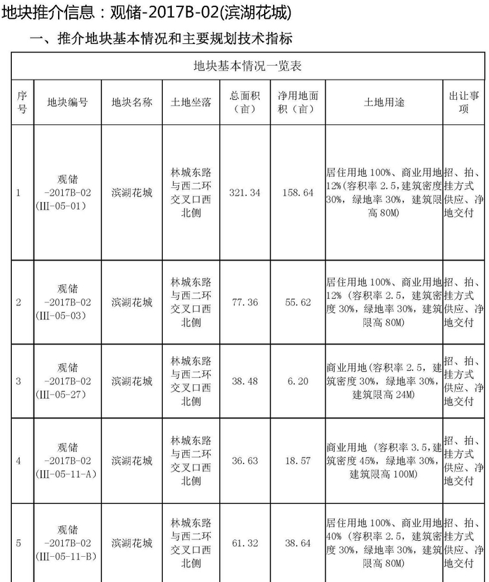 根据推介信息,观储-2017B-02(滨湖花城)地块位于观山湖区林城东路与西二环交叉口西北侧,共分为5宗土地(2宗商业用地、3宗商住用地),总净用地面积为277.67亩,将采用招、拍、挂方式供应,净地交付。具体用途及规划信息见下图。