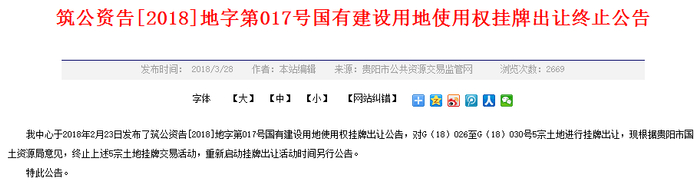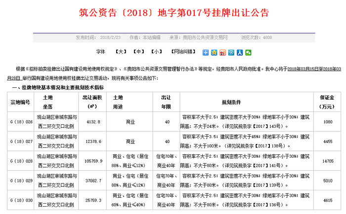 据悉,观储-2017B-02(滨湖花城)地块曾于今年2月23日挂牌于贵阳市公共资源交易网,当时发布的挂牌公告为筑公资告〔2018〕地字第017号,挂牌土地地宗号为G〔18〕026-030号。后在3月28日,贵阳市公共资源交易网发布公告称:“根据贵阳市国土资源局意见,终止上述5宗土地挂牌交易活动,重新启动挂牌出让活动时间另行公告。”