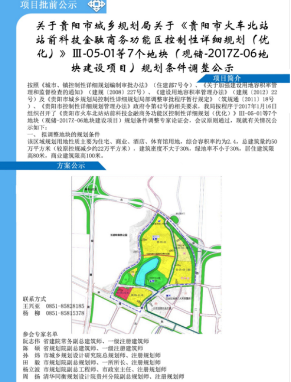 去年3月14日,贵阳市城乡规划局曾发布关于《贵阳市火车北站站前科技金融商务功能区控制性详细规划(优化)》Ⅲ-05-01等7个地块(观储-2017Z-06地块建设项目)规划条件调整公示。公示显示,该区域规划用地性质主要为住宅、商业、酒店、体育馆用地,综合容积率约为2.4,总建筑量约50万平方米(较原控规减少约22万平方米),建筑密度不大于30%,绿地率不小于30%,居住建筑限高80米,商业建筑限高100米。