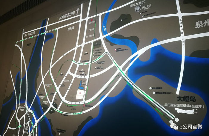 从厦门岛内北上穿过渡海翔安隧道出来,开车前往该项目大约需要大约数十分钟。道路两边绿化还没跟上,大部分楼盘尚在施工,外墙密密实实罩在绿色防护网上,吊塔高高俯视着一方黄褐色土地,四周被阳光照得发亮。