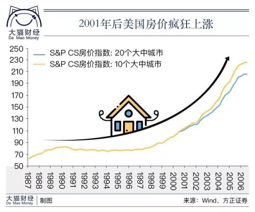 2001年,互联网泡沫破灭,以前一票难求的互联网公司股票都成了废纸,经济衰退,小布什总统当时的对策是刺激房地产,提出了“居者有其屋”这种唬人的计划。