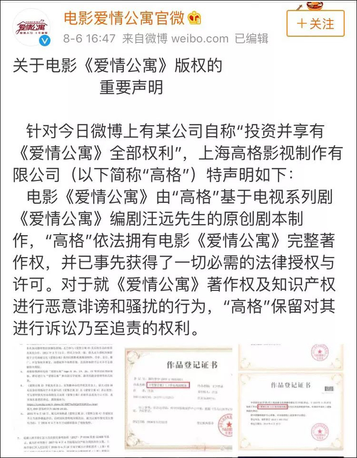 事件曝光不到3个小时,高格方面就通过影版《爱情公寓》官微发布声明,否认侵权。