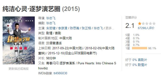 豆瓣评分目前2.7,直逼《逐梦演艺圈》,差点成为史上最低评分。