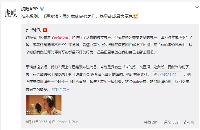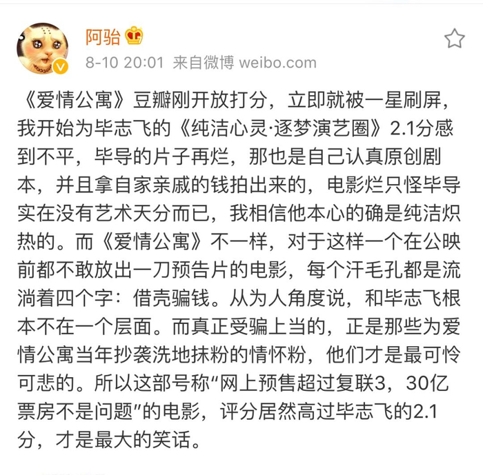 10日下午,电影《爱情公寓》导演韦正在微博发布长文,疑似回应网友争议。