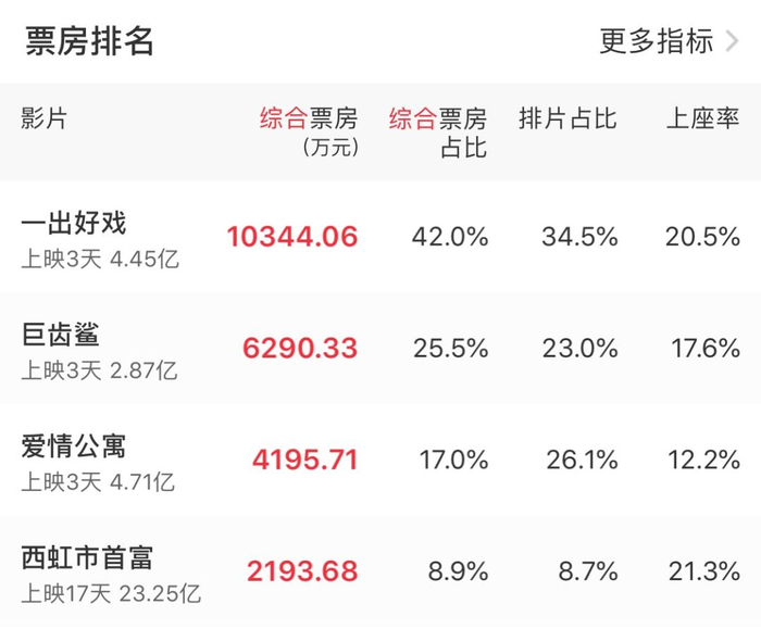 据新浪电影,黄渤《一出好戏》周六收1.9亿票房,逆袭成为单日票房冠军;影版《爱情公寓》不见首日辉煌,周六收1.27亿位列第二;《巨齿鲨》排片率虽略微下降,但票房占比却有提高,周六收1.13亿居第三。