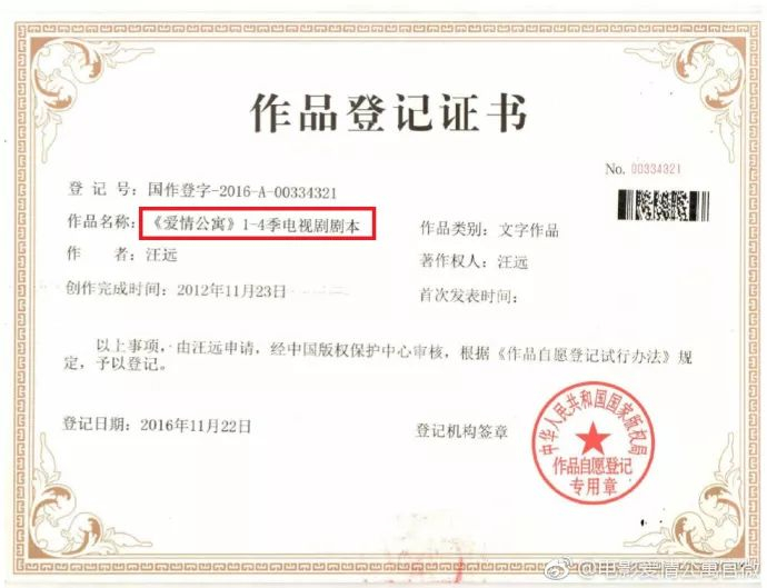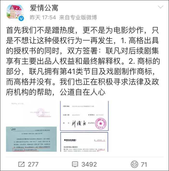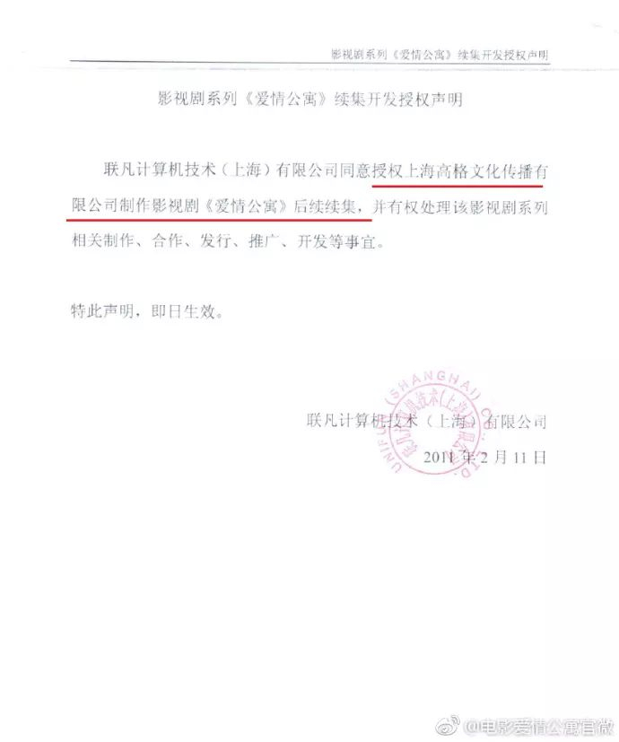 该微博又晒出1-4季《爱情公寓》的作品登记证书及联凡给高格的续集开发授权声明,并表示高格依法拥有电影《爱情公寓》完整著作权,并已事先获得了一切必需的法律授权与许可。