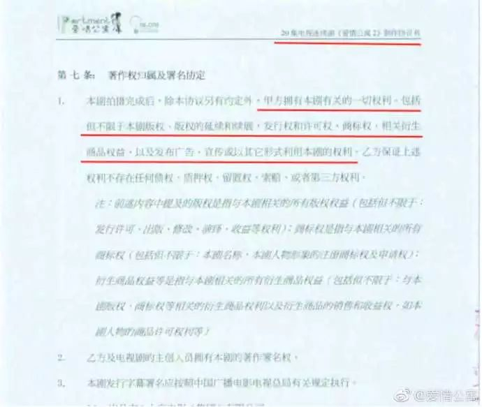 “情景剧《爱情公寓制作协议书》”上则显示,甲方联凡“拥有本剧有关的一切权利,包括但不限于本剧版权、版权的延期和续展、发行权和许可权、商标权、相关衍生商品权益,以及发布广告、宣传或以其它形式利用本剧的权利”。