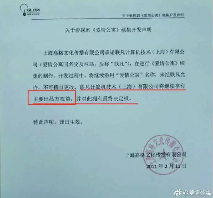 此外,对于就《爱情公寓》著作权及知识产权进行恶意诽谤和骚扰的行为,高格保留对其进行诉讼乃至追责的权利。