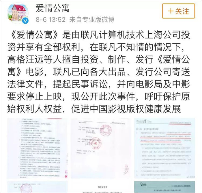 8月6日下午1点许,微博@爱情公寓 突然晒出多份协议书,称《爱情公寓》是由联凡计算机技术上海公司投资并享有全部权利。而汪远等人在联凡不知情的情况下,擅自投资、制作、发行电影。联凡方面已向各大出品、发行公司寄送法律文件,提起民事诉讼,并向电影局及中影要求停止上映。