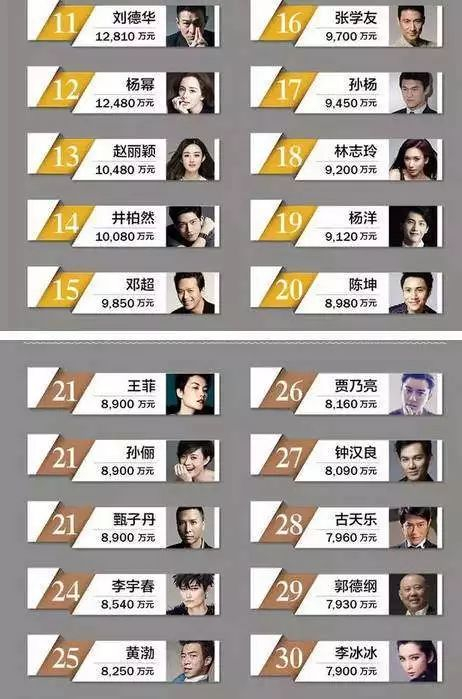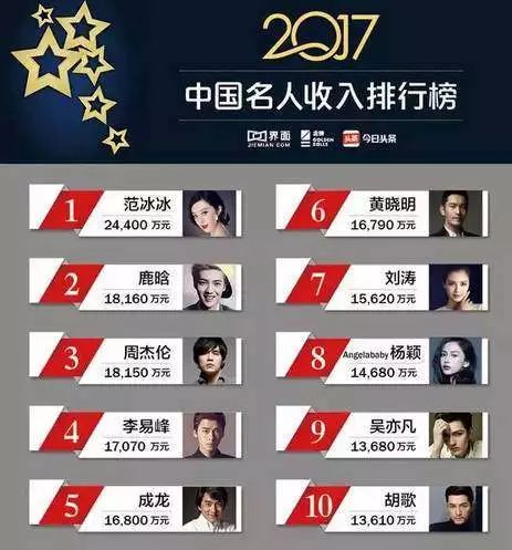 2017年名人收入榜单则显示,榜单前10位明星的收入总和近17亿元。他们数百万上千万的片酬,可轻松傲视众多创业者以及企业高管的年薪收入。而入榜名人动辄数千万上亿元的年收入,甚至堪比一家上市公司整整一年的利润。