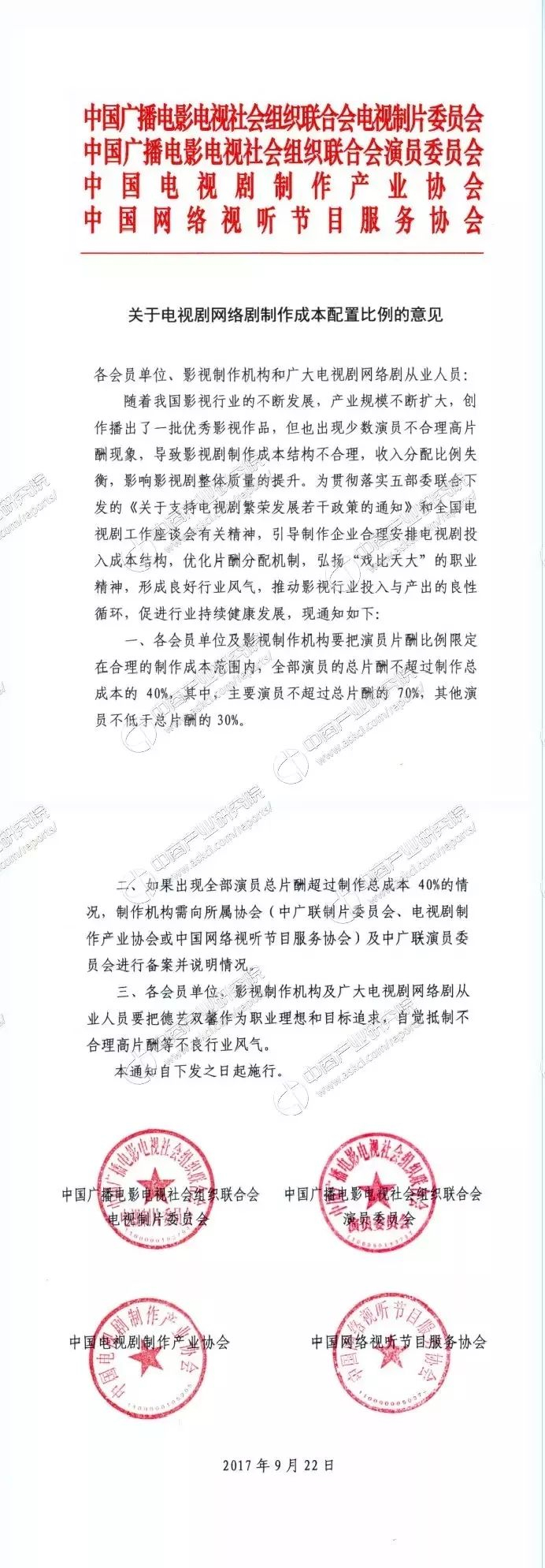 2017年9月,中国广播电影电视社会组织联合会电视制片委员会、中国广播电影电视社会组织联合会演员委员会、中国电视剧制作产业协会、中国网络视听节目服务协会曾联合发布《关于电视剧网络剧制作成本配置比例的意见》。