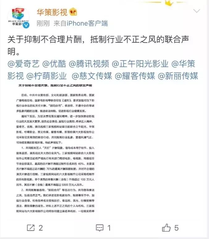 8月11日,爱奇艺、优酷、腾讯视频、正午阳光、华策影视、柠萌影业、慈文传媒、耀客传媒、新丽传媒联手发布《关于抑制不合理片酬,抵制行业不正之风的联合声明》。