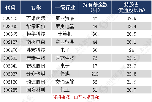 按照主动管理型基金持股占流通股本的比例来看,据申万宏源研究统计,2018年二季度,基金抱团股之首为芒果超媒,共计47只主动管理型基金持有该股,总计持股比例占流通股的比重高达39.6%。