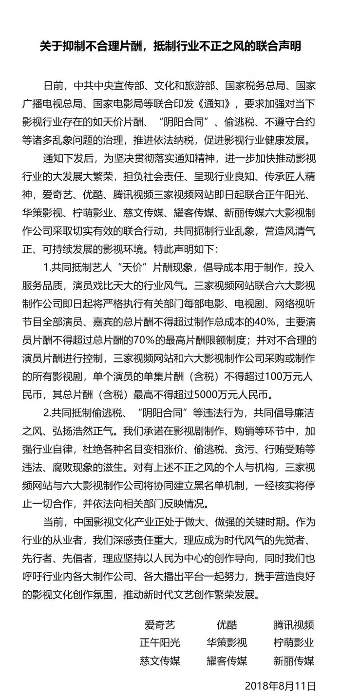 8月11日,爱奇艺、优酷、腾讯视频、正午阳光、华策影视、柠萌影业、慈文传媒、耀客传媒、新丽传媒联手发布《关于抑制不合理片酬,抵制行业不正之风的联合声明》。