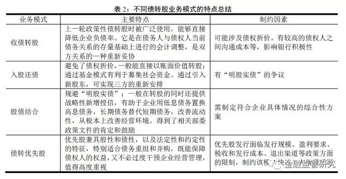 根据处置债权和转股的先后顺序,债转股可分为“入股还债”和“收债转股”两种模式;根据债权转换成股权类型的不同,可分为债转“普通股”和“优先股”两种模式;根据实施方案的复杂性,可分为“股债结合”的综合性方案和单一性转股方案(不同模式的特点总结见表2)。