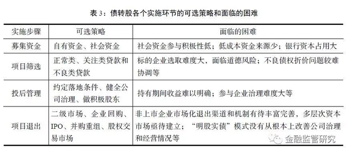 基于对债转股实施过程中“募、投、管、退”四个环节所面临的困难进行的梳理,结合各个步骤可选择的实施策略,汇总后得到表3。