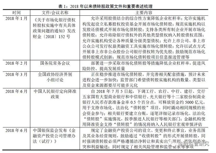 在市场化债转股被首次公开提出后的两年时间里,建立了国家发改委牵头的部级联席会议制度,多个部委出台一系列有关推动市场化、法制化债转股,降低非金融企业杠杆率的政策文件,逐步明确债转股实施的指导原则、资金来源和实施主体等内容,相关政策支持日益完善,为有序稳妥地推进债转股工作提供了良好的制度环境。同时,从陆续发布的相关政策文件的内容可以看出,市场化债转股是一项创新性工作,需要不断探索和完善,没有现成的、固定的模式可选(2018年以来相关重要的政策文件和官方场合的重要表述见表1)。因此,相关部门和银行、实施机构都要认真总结实践经验,在不断发现问题、解决问题的过程中,完善相关政策细节和实务操作。