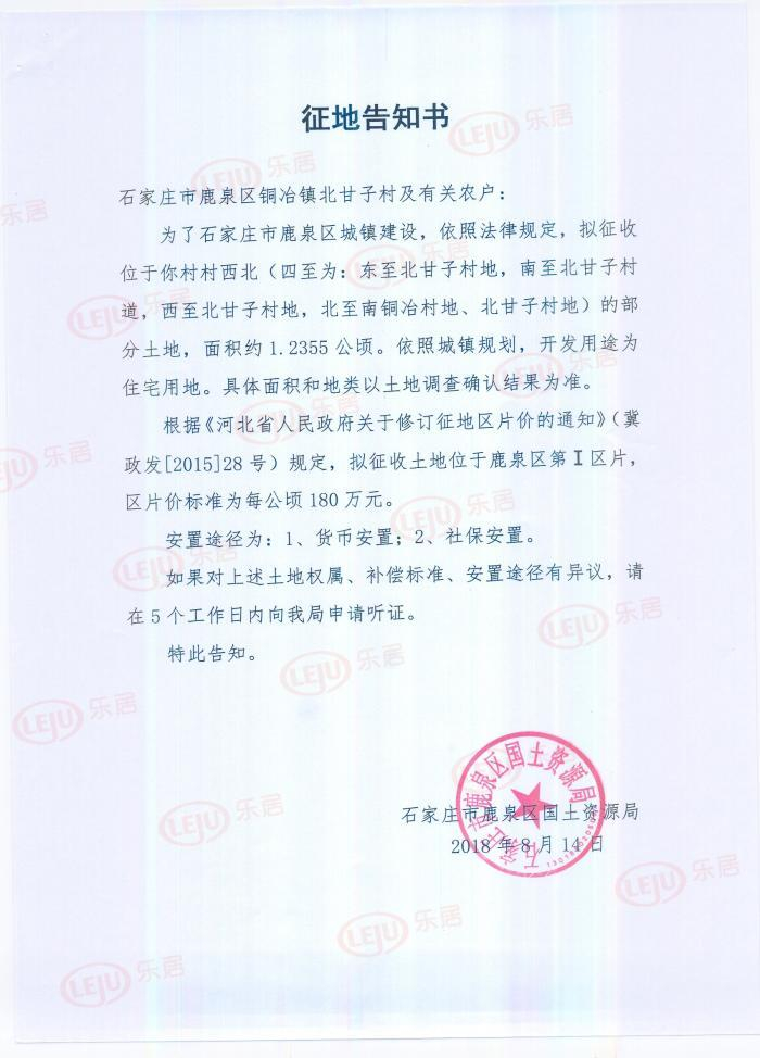 拟征收鹿泉铜冶镇北甘子村村西北的一宗土地,四至为:东至北甘子村地、南至北甘子村道、西至北甘子村地、北至南铜冶村地、北甘子村地,面积约1.2355公顷,约合18.53亩,依照城镇规划,开发用途为住宅用地。拟征收土地位于鹿泉区第Ⅰ区片,区片价标准为每公顷180万元。安置途径为1、货币安置,2、社保安置。