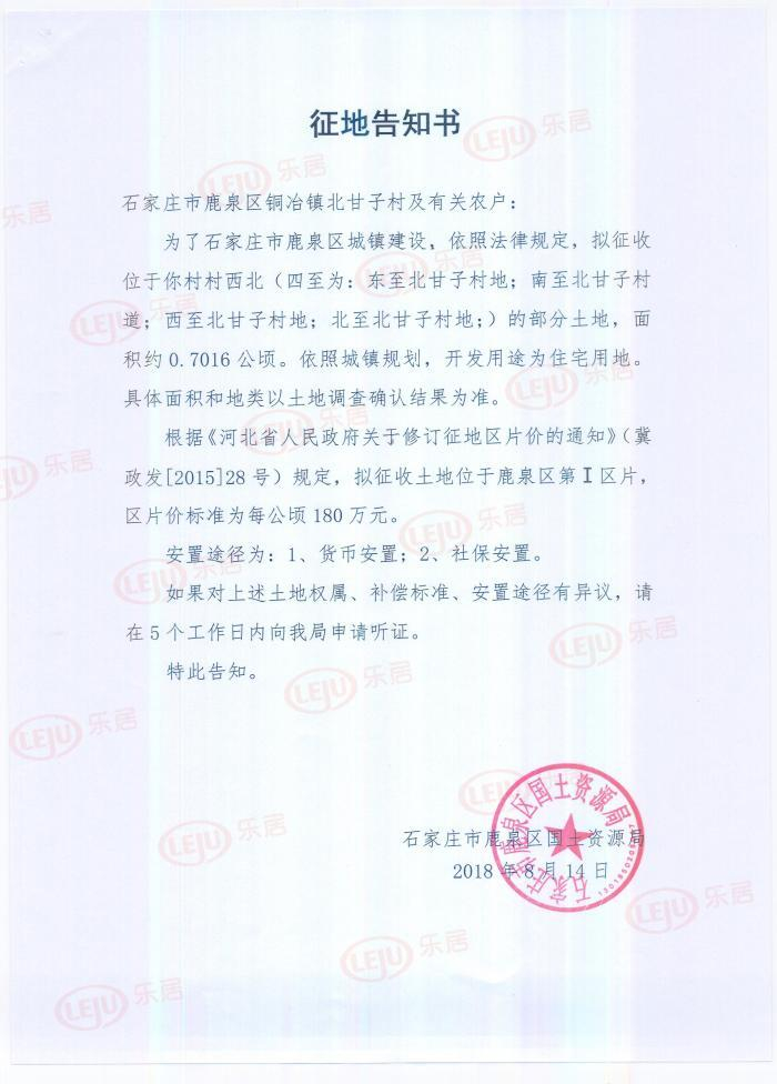 拟征收鹿泉铜冶镇北甘子村村西北的一宗土地,四至为:东至北甘子村地、南至北甘子村道、西至北甘子村地、北至北甘子村地,面积约0.7016公顷,约合10.52亩,依照城镇规划,开发用途为住宅用地。拟征收土地位于鹿泉区第Ⅰ区片,区片价标准为每公顷180万元。安置途径为1、货币安置,2、社保安置。