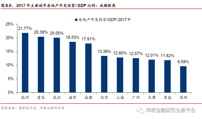 成都的城市外延扩张空间较大,赋予了城市建设及房地产业活力。由于成都位于四川盆地内的成都平原,平原面积占全市面积的40.1%,是西部少见的平原为主要地形的城市,故而城市交通便利,外延发展空间较大。2016年,简阳市(县级市)改由成都市代管,成都市的辖区面积进一步扩大。城市外延扩张空间较大赋予了城市建设、房地产业发展活力,为成都银行带来发展优势。2017年,成都市房地产开发投资与GDP的比例为17.91%,居同经济体量城市前列。
