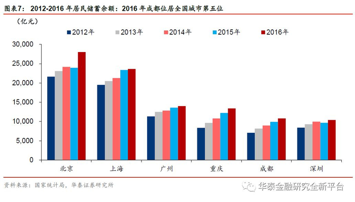 成都是西南地区的中心城市,经济实力强劲,常住人口居副省级城市首位。成都是西南地区的物流、商贸、金融、科技、文化、教育中心及交通、通信枢纽,也是全国八大中心城市之一。从经济上看,成都2017年GDP达1.39万亿元,为西部第二大经济强市(仅次于重庆)。成都的GDP占四川省GDP总量的37.24%,属于典型的“一省一城独大”。从人口上看,截至2017年末,成都人口达1604万,居全国副省级城市首位。在经济与人口的双重作用下,2016年末成都居民储蓄余额居全国前五位。