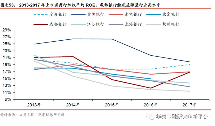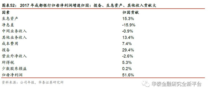 我们对2017年成都银行的归母净利润增速进行归因分析,资产质量的改善和规模的扩张是归母净利润高增速的主要原因。2017年,成都银行归母净利润增速达51.64%,高居上市城商行之首。我们对归母净利润的增速进行拆解:2017年,生息资产同比增速提升至20.34%,但资产扩张与息差收紧的效应出现抵消,净利息收入同比微降0.59%。而在基金投资大幅增长的背景下,投资净收益带动营业收入同比增长11.99%。2017年,公司资产质量大幅改善,资产减值损失成为归母净利润的最大正贡献项,2017年资产减值损失同比下降15.66%,对归母净利润的正向贡献达29.4%。