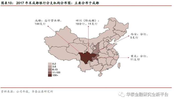 成都银行在成都及四川省均具有较高的市占率,并控股成立了四川锦程消费金融公司及参股西藏银行。截至2017年末,成都银行在成都设立144家支行,在广安、资阳、眉山、内江、南充、宜宾、乐山、德阳、阿坝、泸州设立了10家分行,在重庆、西安设立了跨省分行。截至2017年末,成都银行在成都地区的存款总额和贷款总额分别为3201元及1146亿元,分别占成都市总额的9.3%、4.0%;公司全部存款总额和贷款总额分别占四川省总额4.5%、2.4%。公司的发展战略为维持公司业务支柱地位、以小微业务为战略重点、巩固扩大个金业务战略优势地位、以资金业务为战略新兴增长点,并以四川+重庆+陕西的“一体两翼”为区域发展战略。此外,公司还持有西藏银行5.3%的股份;并与丰隆银行合作成立了锦程消费金融公司(成都银行持股51%)。锦程消费金融为我国首批、中西部第一家消费金融公司,2017年净利润为6055万元。